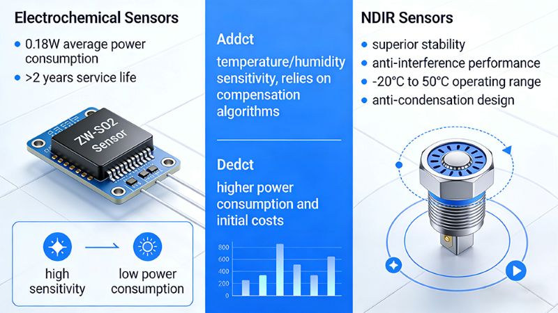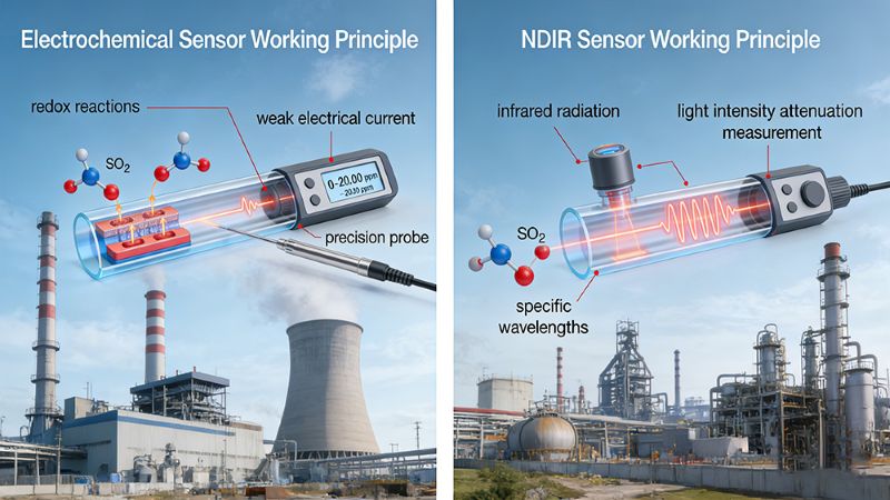 January 15 , 2026في مجال الرصد البيئي الصناعي، يُعدّ الكشف الدقيق عن ثاني أكسيد الكبريت (SO₂) خطوةً حاسمةً في ضمان الأمن البيئي. وباعتبارهما حلّين تقنيين رئيسيين، تُظهر أجهزة الاستشعار بالأشعة تحت الحمراء غير المشتتة (NDIR) وأجهزة الاستشعار الكهروكيميائية مزايا تنافسية واضحة في سيناريوهات تطبيقية مختلفة، وذلك استنادًا إلى آلياتهما التقنية الفريدة.