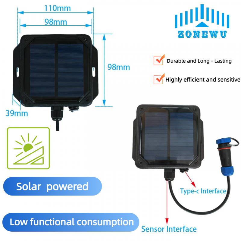 جهاز استشعار ZONEWU الشمسي بتقنية LoRa لقياس الموصلية الكهربائية ودرجة الحموضة ودرجة الحرارة والرطوبة في التربة هو جهاز مراقبة بيئية يدمج بين الطاقة الشمسية وتقنية الاتصال عن بُعد. وتتمثل وظيفته الأساسية في جمع بيانات الموصلية الكهربائية ودرجة الحموضة ودرجة الحرارة والرطوبة في التربة في الوقت الفعلي.